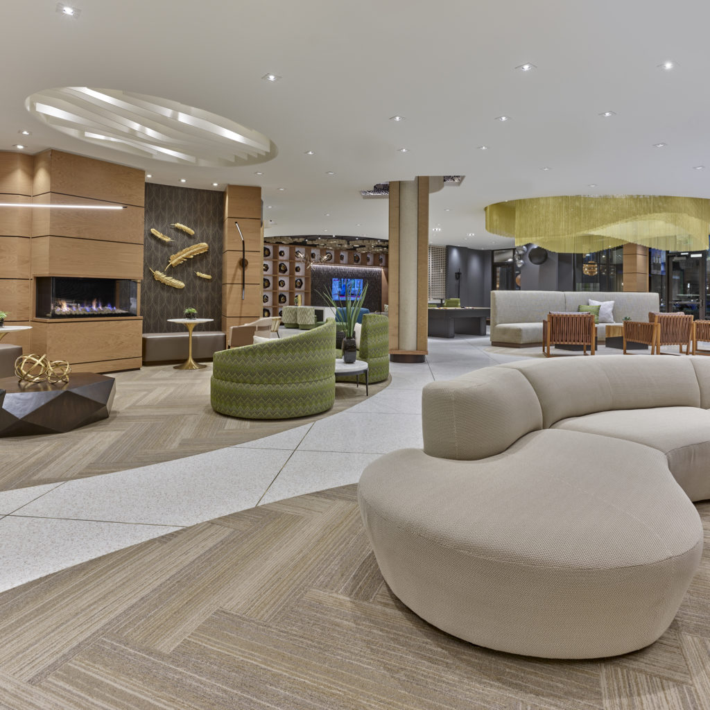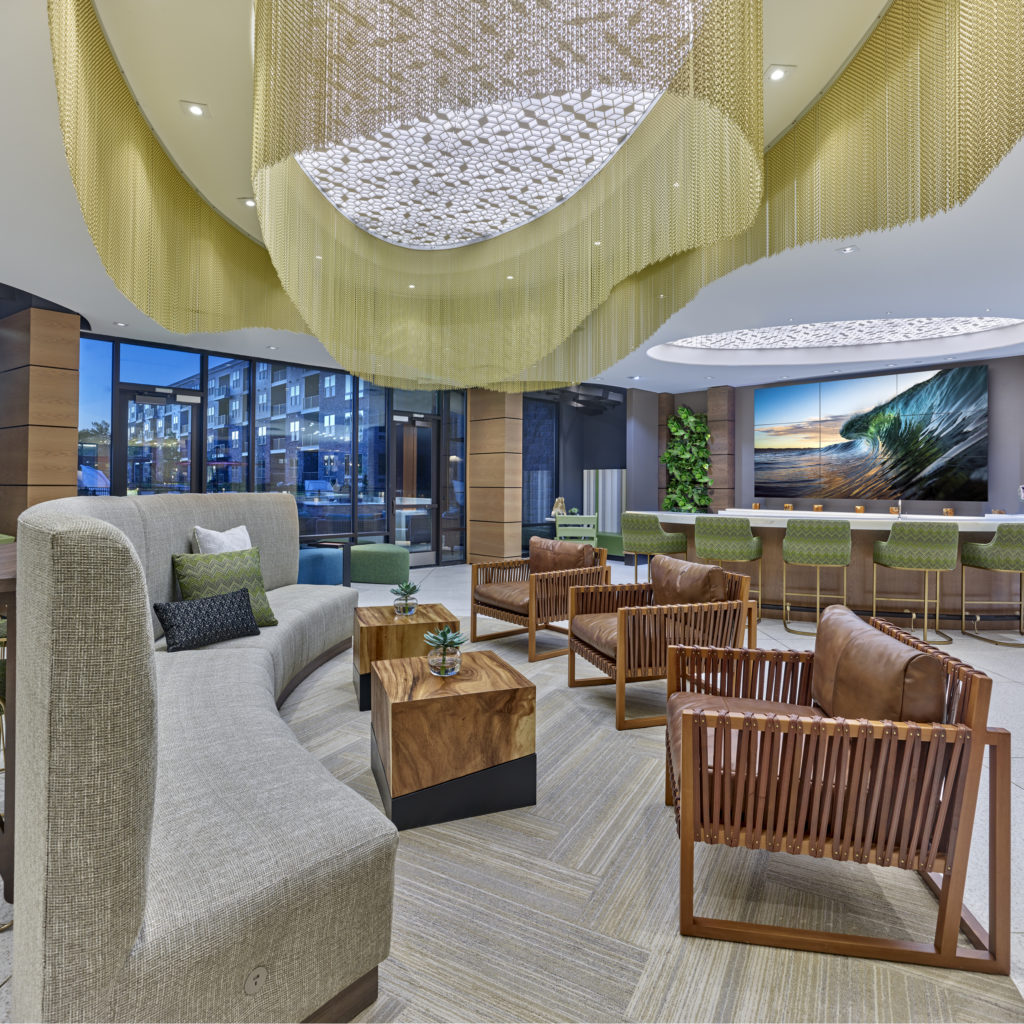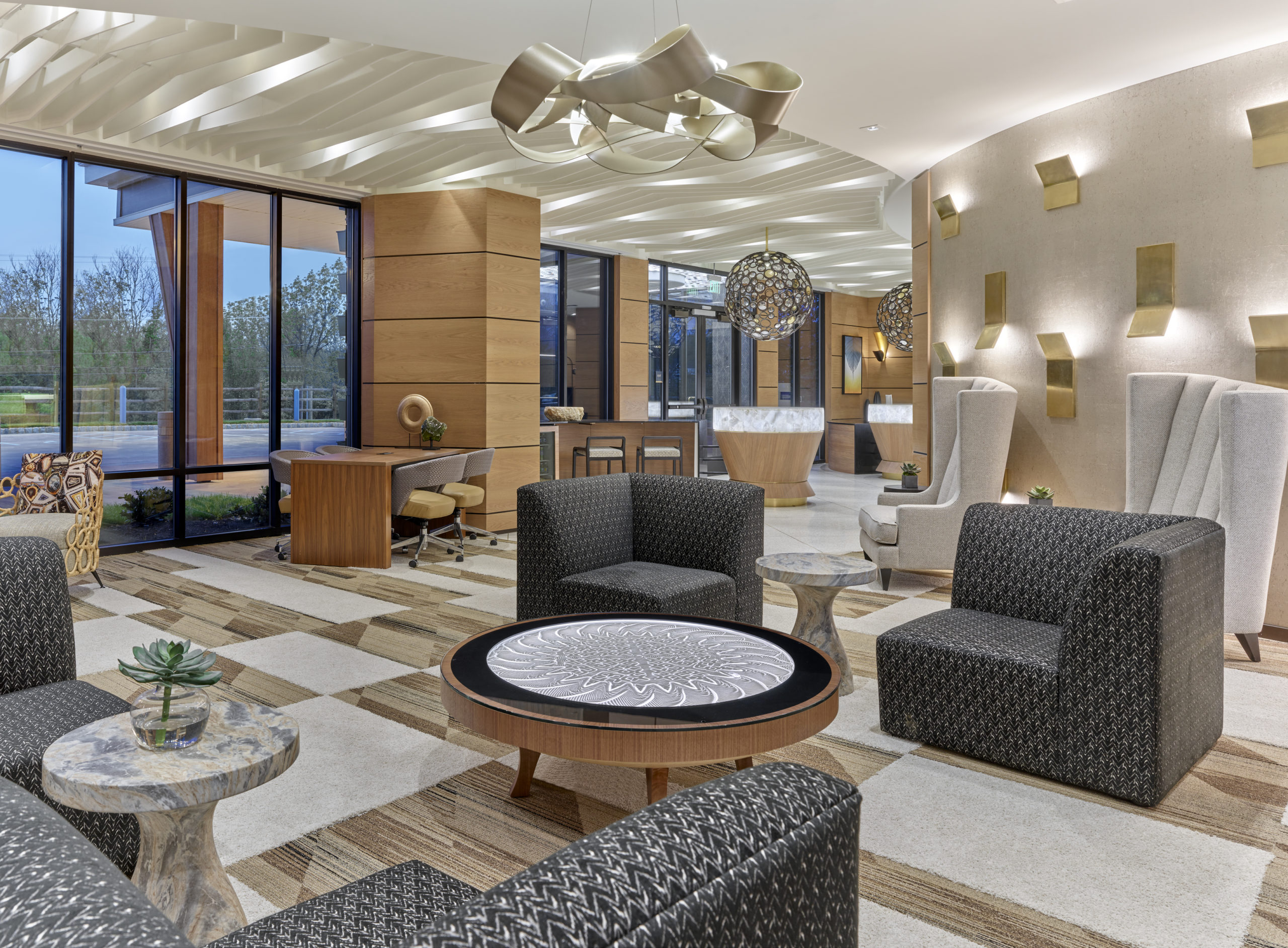 Inspired by nature, it’s the perfect site for an interior mindful of Biophilic Design, a design solution that reconnects people to the natural environment. The design concept carries nature to the inside with elements like Zen inspired kinetic sand; live green walls; digital imagery of waterfalls; light woods, reflected light, and natural wood for a sense of peace and serenity. This design style, Earthy Modern, is refined and organic highlighted by simplicity and natural patterns. Warm mid-century furnishings with classic lines, and a neutral color palette with tones of green and gold to complete the look.