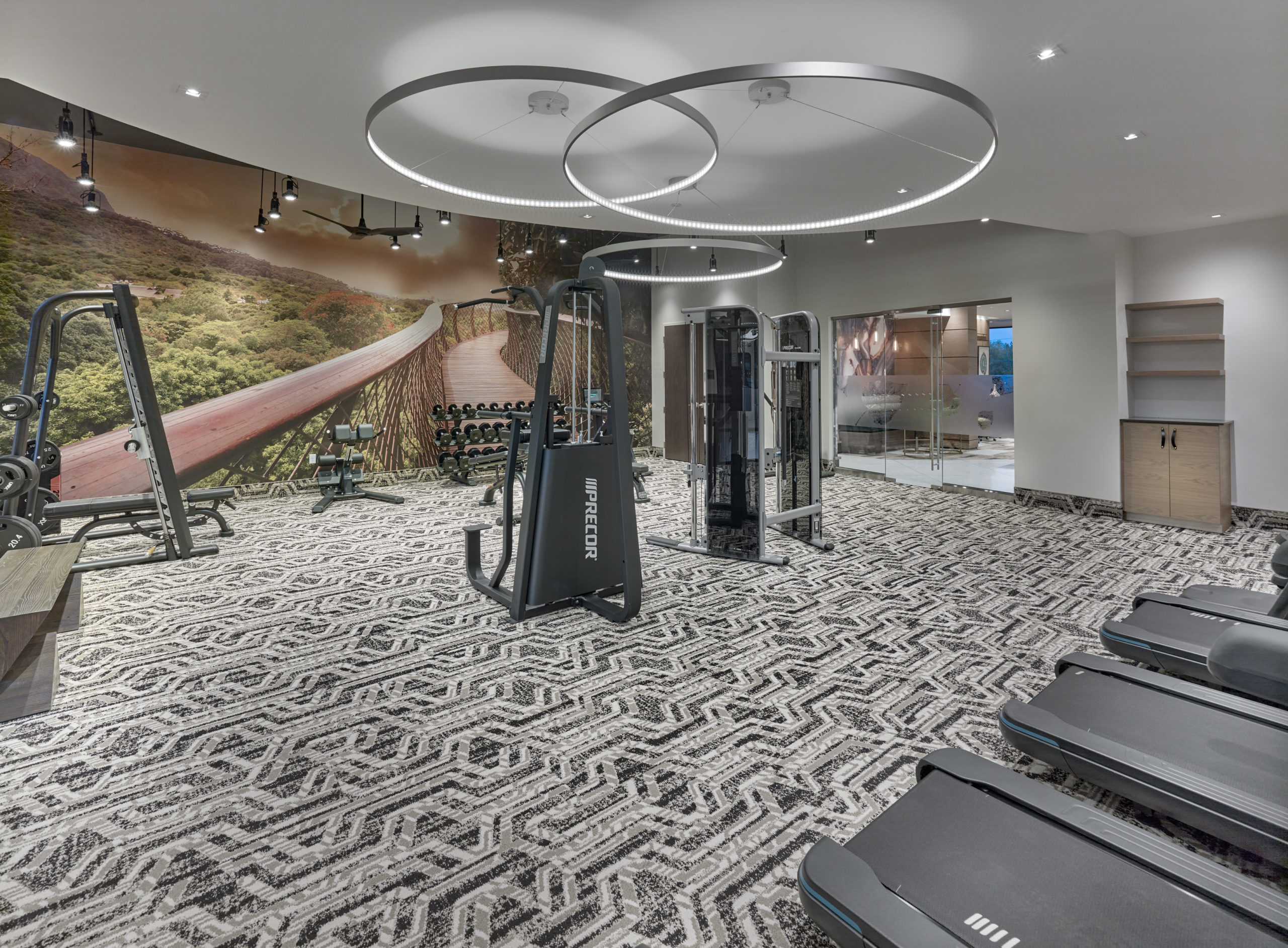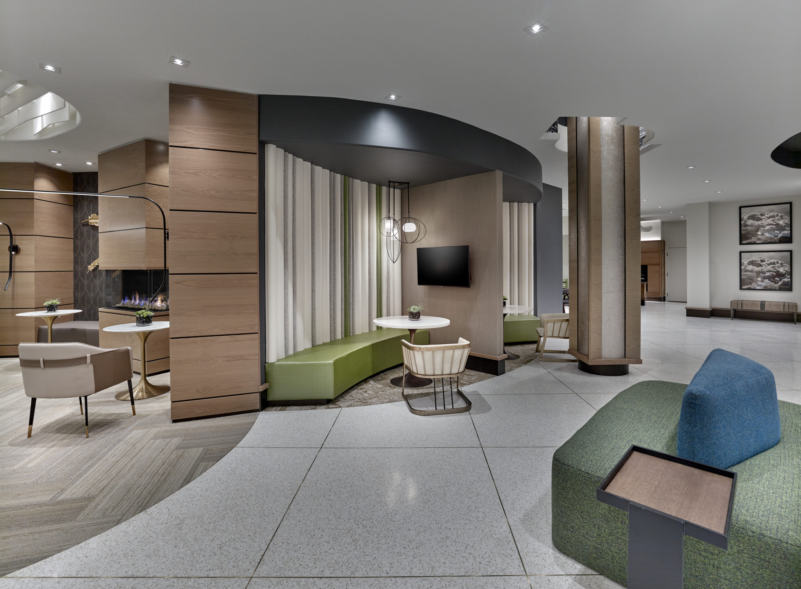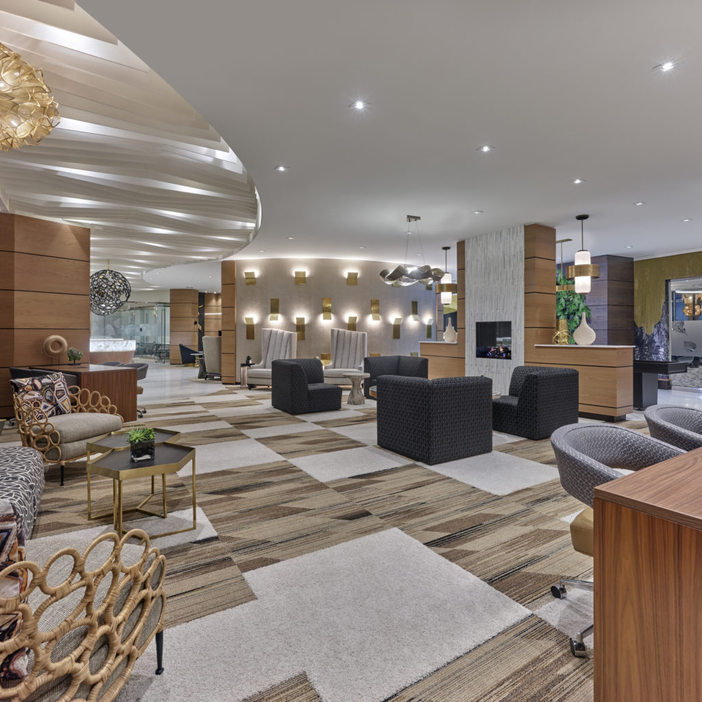 Inspired by nature, it’s the perfect site for an interior mindful of Biophilic Design, a design solution that reconnects people to the natural environment. The design concept carries nature to the inside with elements like Zen inspired kinetic sand; live green walls; digital imagery of waterfalls; light woods, reflected light, and natural wood for a sense of peace and serenity. This design style, Earthy Modern, is refined and organic highlighted by simplicity and natural patterns. Warm mid-century furnishings with classic lines, and a neutral color palette with tones of green and gold to complete the look.